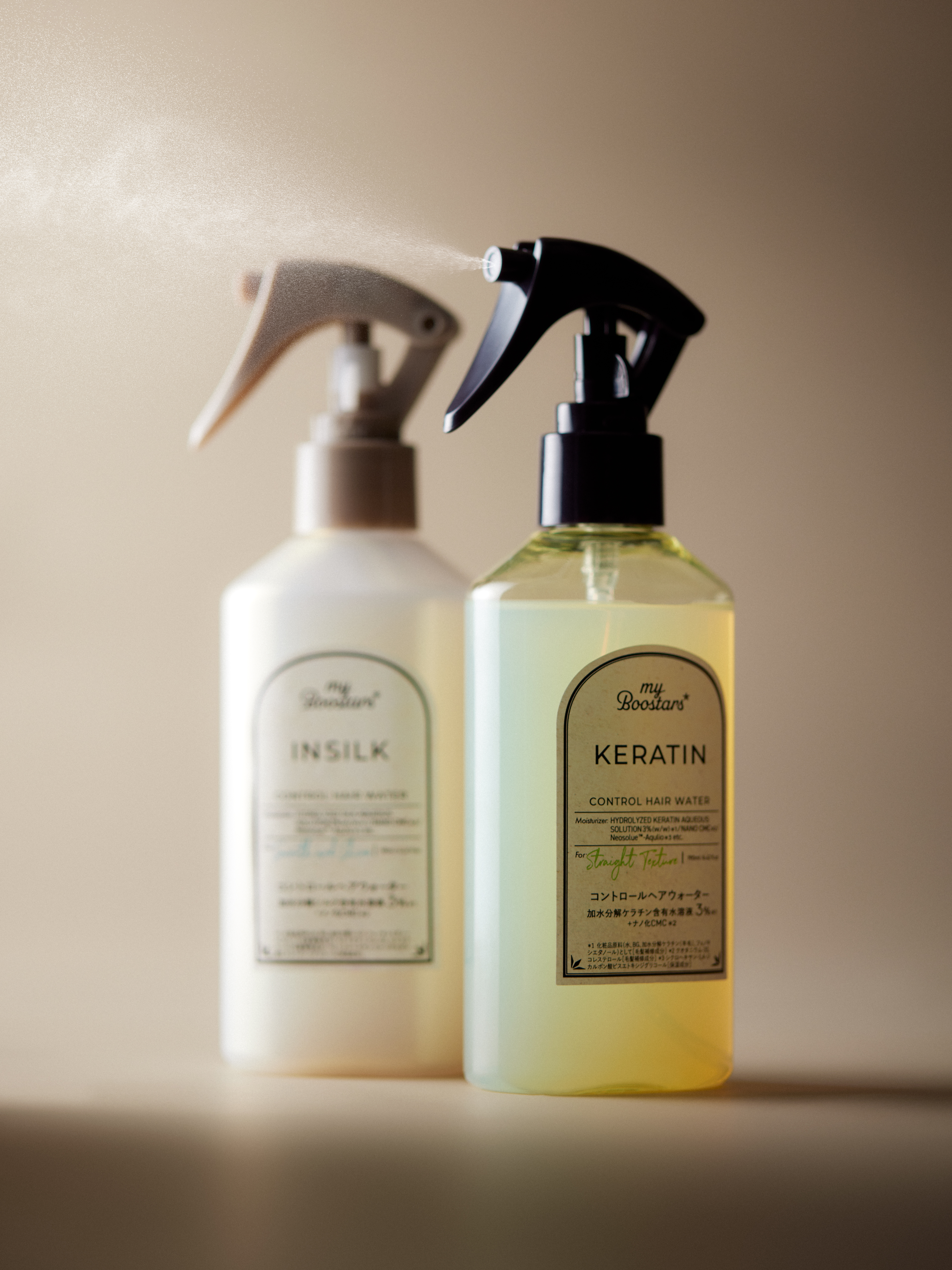 髪の構成要素であるタンパク質・脂質・水分のバランスに着目することで、髪内部の構造を最適化します。 また「myBoostars」のブースター技術を通して補修成分をすばやく髪の内部へ届けることでダメージ補修と質感ケア、両方を1本で叶える新しいヘアミストです。ストレートな指通りの「ケラチン」と、サラツヤ質感の「インシルク」仕上がりのタイプ別に2種類ご用意。毎日の様々なシーンで使える軽やかなウォータータイプです。